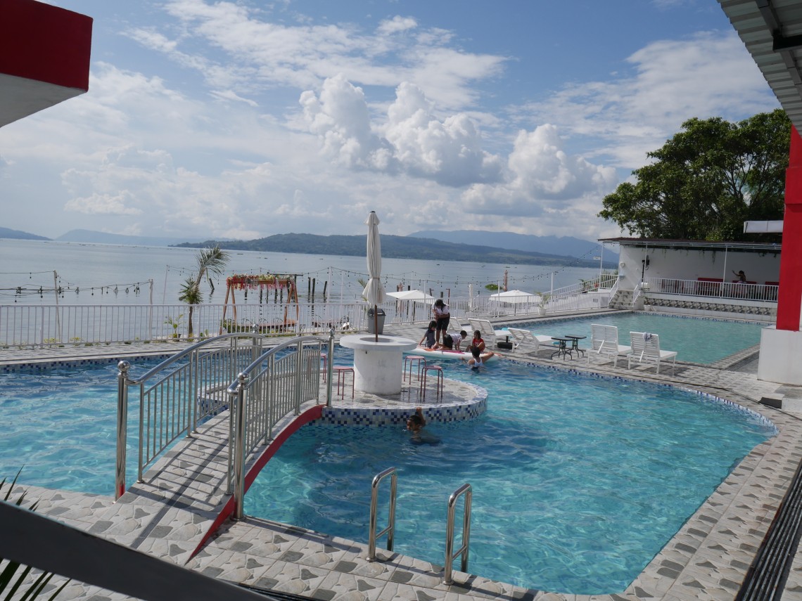 Kolam renang dengan latar Danau Toba — tempat ideal untuk bersantai sore sambil menikmati langit jingga.